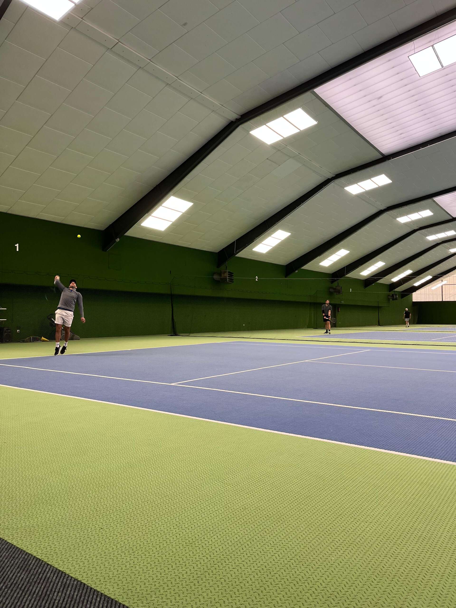 In der zweiten Runde traten Nils und David aufs Parkett. Nils spielte mit aller Routine sein Match runter. Schnell begriff er, dass sein Gegner irgendwann Fehler machte und das viele. Dadurch entschied er die Partie im Schnelldurchlauf für sich. David bekam es mit einem Gegner zu tun, der nicht viel lief, dafür aber druckvoll schnell die Ballwechsel entscheiden wollte. Das gesamte Match über lagen die meisten Ballwechsel bei 2-3 Schlägen. David konnte sich hier voll und ganz auf seine Aufschlagstärke verlassen. Das Break zum 4:3 reichte, um auch 5:3 das Break zum Satzgewinn für sich zu holen. Da nun der Aufschlag zu Beginn des 2. Satzes beim Gegner lag, musste David, wie man so schön sagt, im Rückstand aufschlagen. Zusätzlich schien er angeschlagen, irgendetwas machte sich im Rücken bemerkbar. Ein sehr langes und knappes Aufschlagspiel zum 2:1 und das Break zum 3:1 schien den Gegner nun jedoch gebrochen zu haben. So schien es. Beim 5:1 fing sein Gegner an, sich wieder zu wehren. David hatte keine guten Chancen mehr. Er war sichtlich langsamer auf den Beinen und machte mehr Fehler. Am Ende nahm David beim 5:4 jedoch all seinen Mut zusammen und wurde mit starken ersten Aufschlägen belohnt, die den Sieg einbrachten. 3:1 nach den Einzeln.